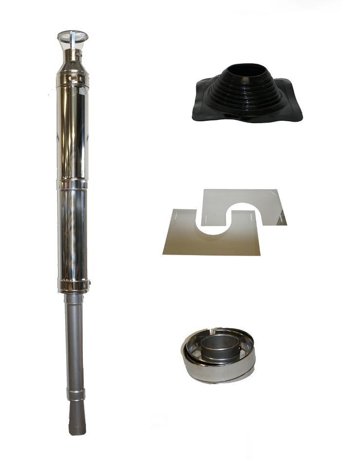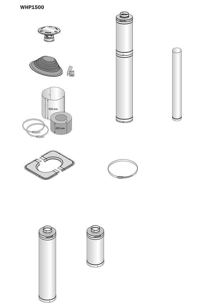The steel chimney starter pack contains: a 1.5 m steel chimney (WHP1500) and a box of accessories including a 1.0 m uninsulated flue pipe, a rain cap, a rubber rain cap and rain cap mounting kit, a stainless steel duct cap and a steel chimney duct insulation and safety cap. The steel chimney can be easily extended with 0,5 (WHP500) and 1,0 (WHP1000) meter long accessories. Thanks to an ingenious mechanism, the accessories are screwed together and the flue tubes are also interlocked thanks to grooves in the tube. This prevents movement due to temperature variations. Indoors, the chimney can be installed at a height of 3 metres without support, and outdoors at 2 metres.